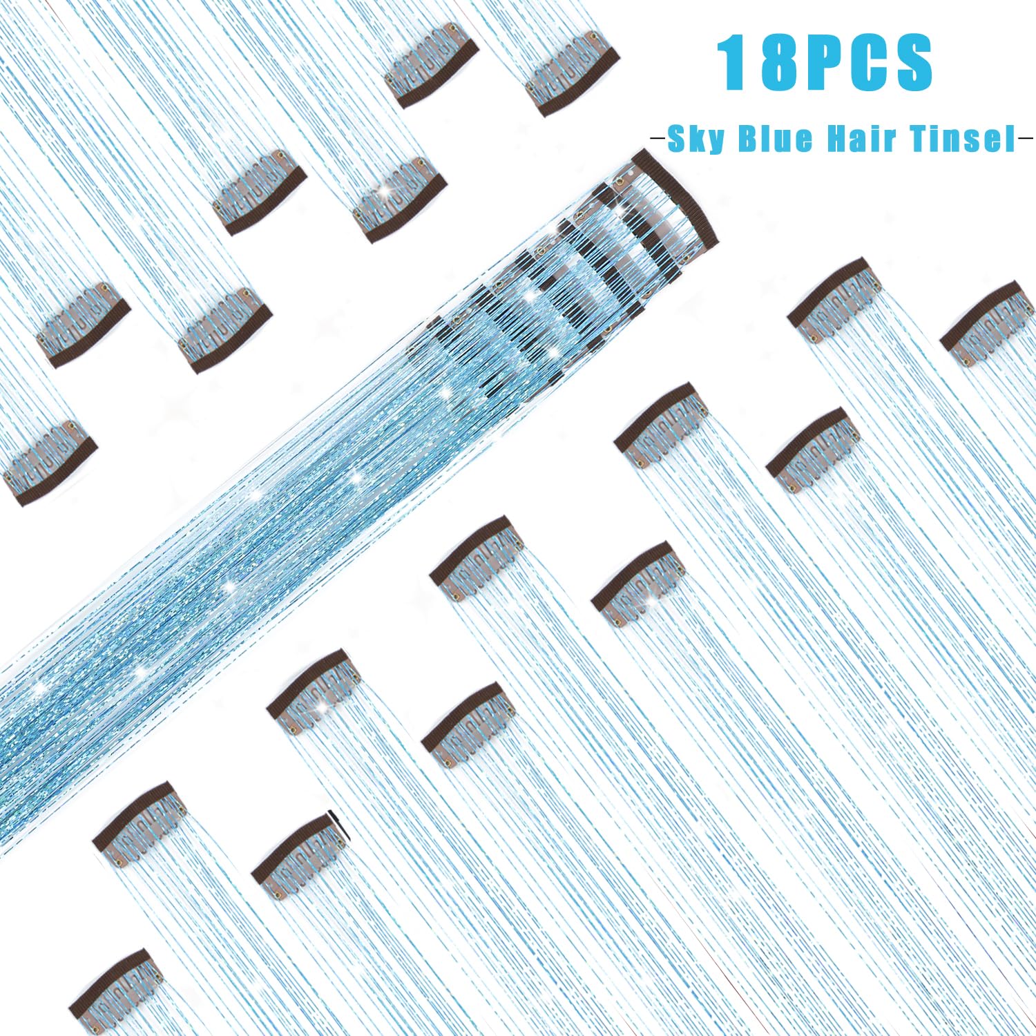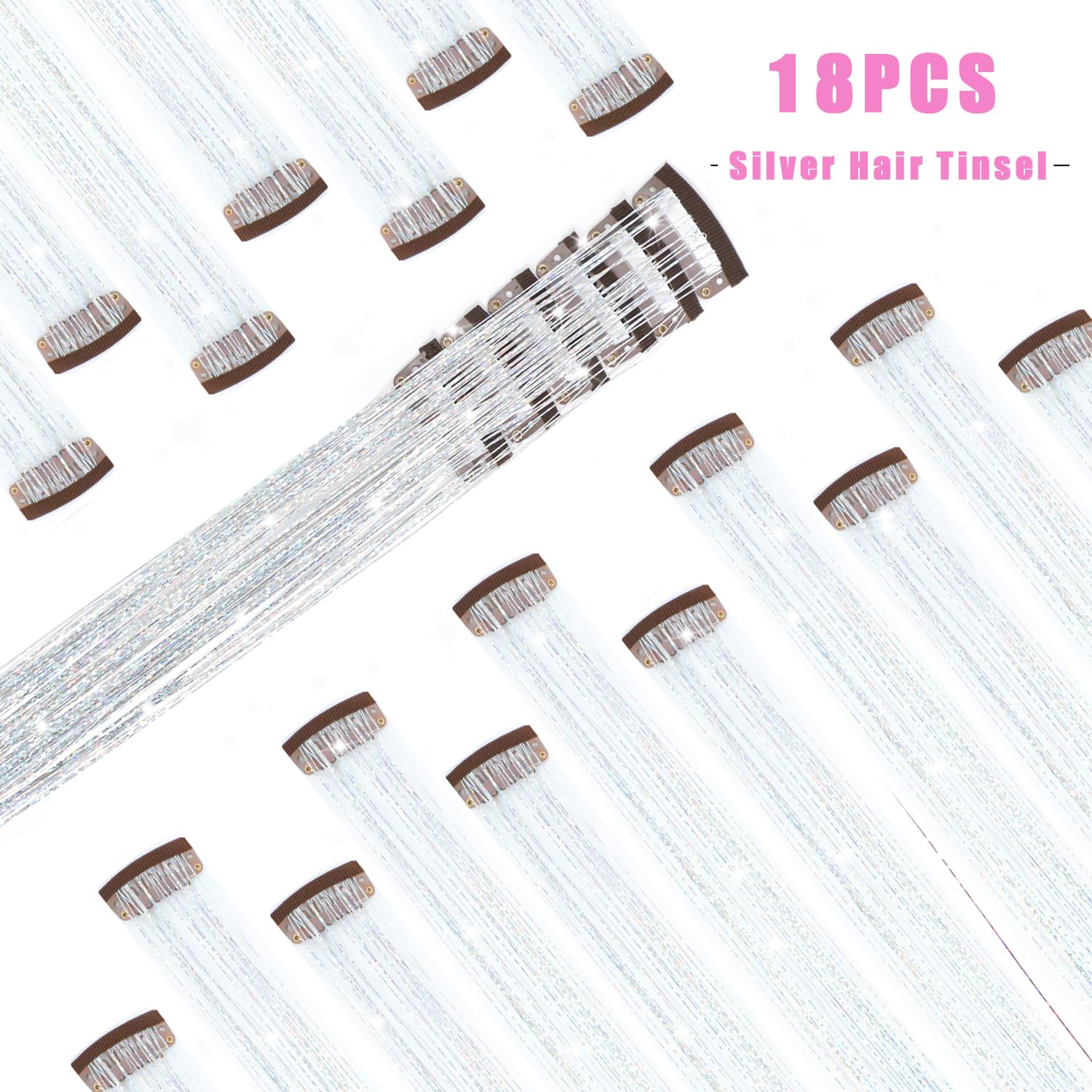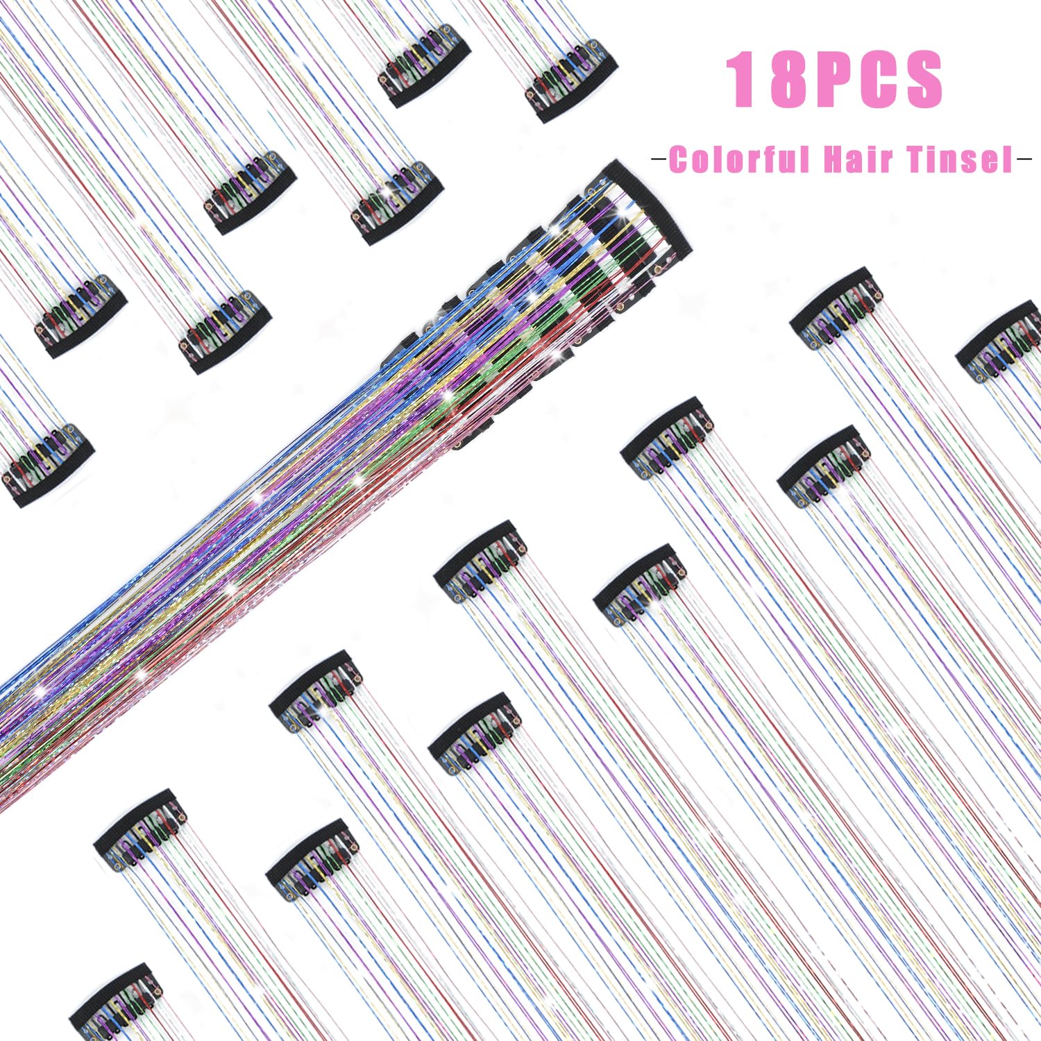 Caedrea Hair Tinsel Clip-In Extensions – 18 Pcs 20.5" Glitter Fairy Hair, Shiny Sparkling Party Highlights, Rainbow Glitter Strands for Girls & Women