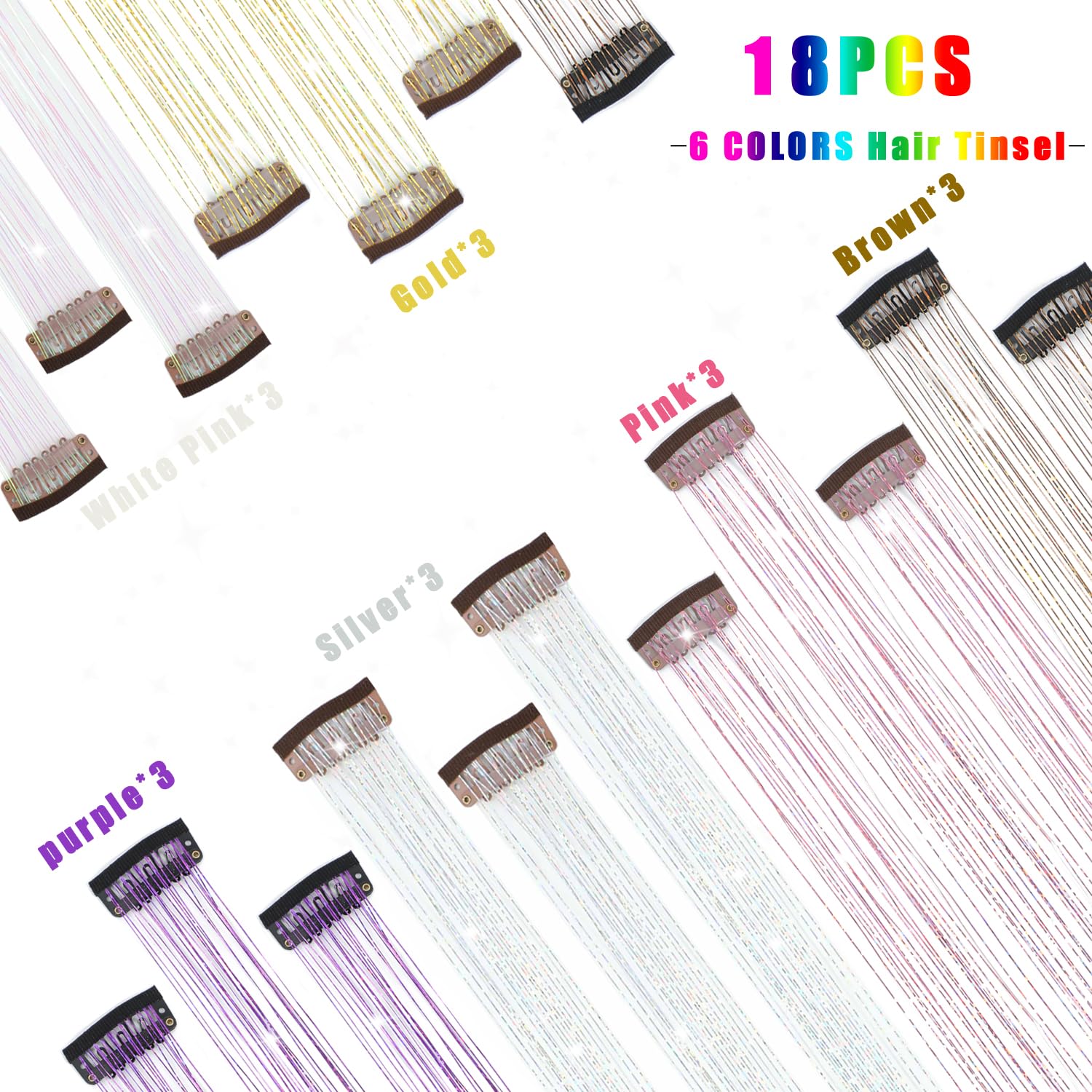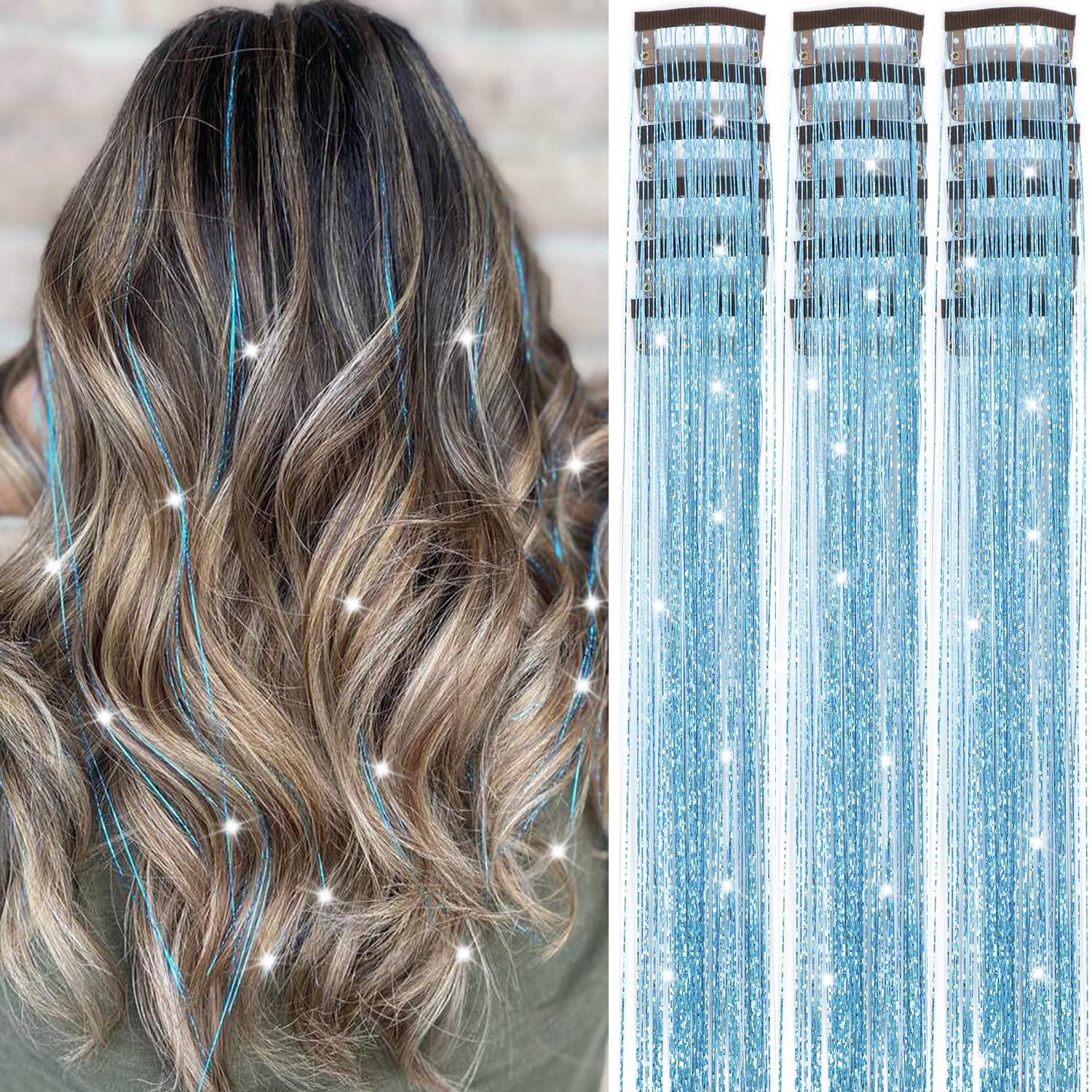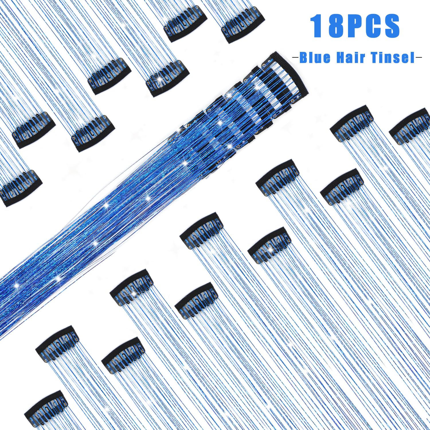 Caedrea Hair Tinsel Clip-In Extensions – 18 Pcs 20.5" Glitter Fairy Hair, Shiny Sparkling Party Highlights, Rainbow Glitter Strands for Girls & Women