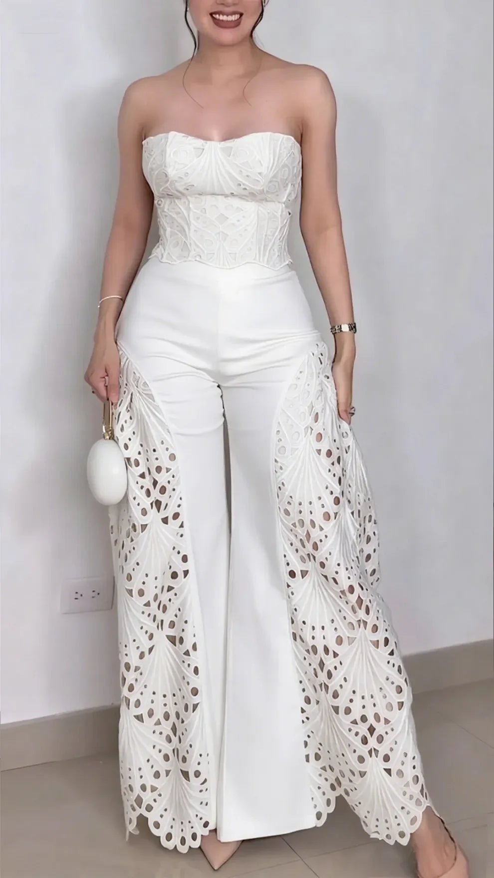 Step into effortless elegance with this embroidered co-ord set, featuring a strapless lace-like eyelet top and wide-leg pants adorned with intricate cutout details ✨.