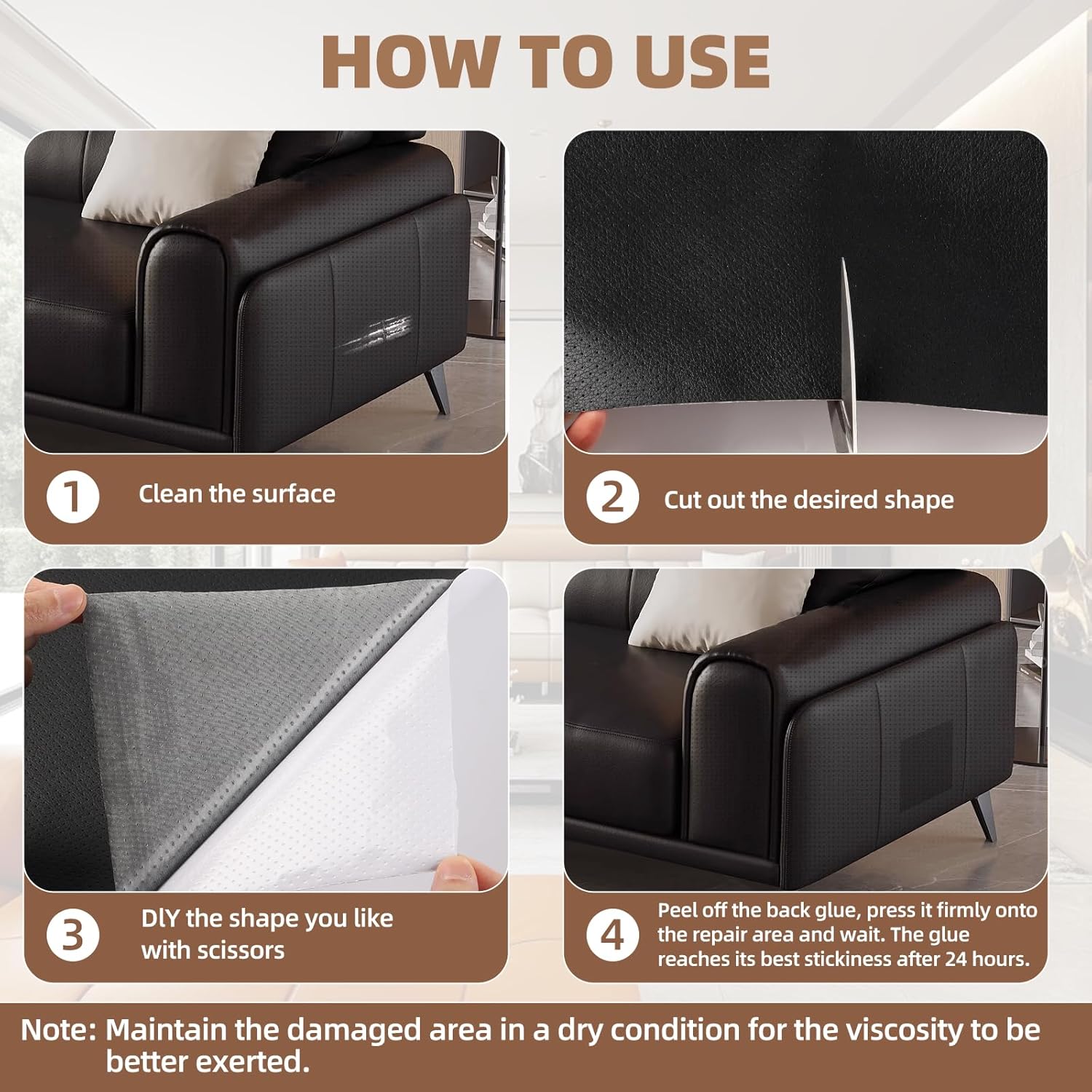 Effortless DIY Repair Solution Skip expensive upholstery services! With its easy peel-and-stick design, you can repair leather and vinyl in minutes—no heat, glue, or sewing needed.