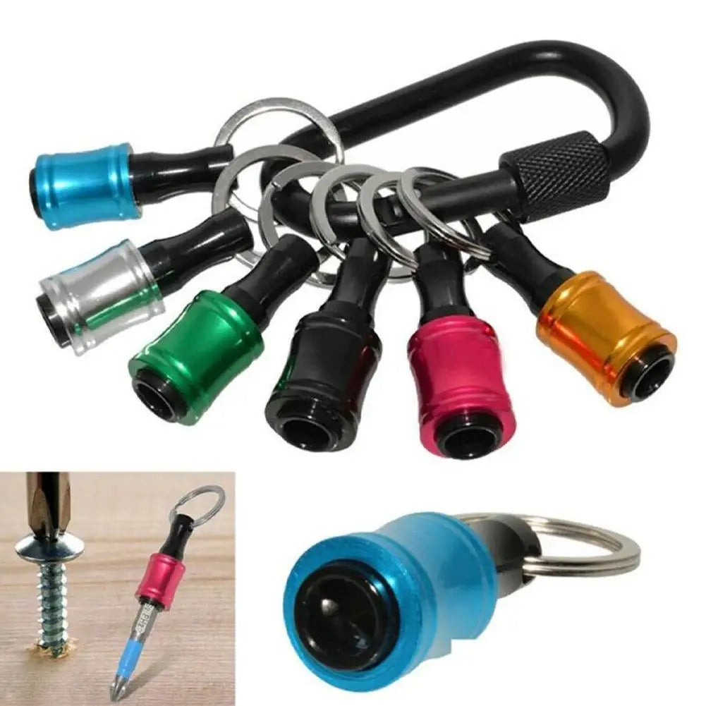 The extension rod is made of aluminium alloy. It can be fitted with a short bit or a long bit. This keychain has a flat, thick and round design, which makes it easier to take the product and change the bit with one hand.